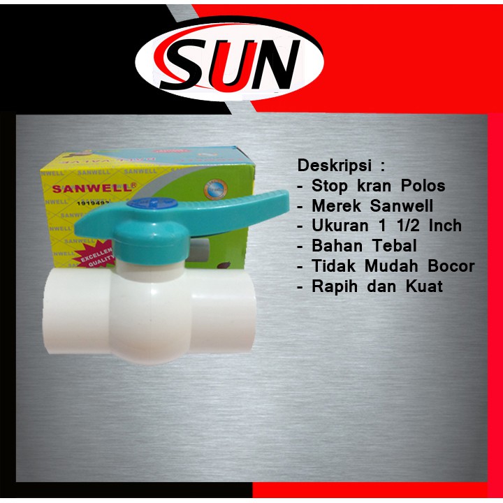 Beberapa keuntungan membeli online yakni membantu pengguna menghemat waktu. Hal ini selevel dengan norma lazimnya orang sekarang yang lumayan aktif serta susah menemukan waktu untuk memesan di toko konvensional. Dengan membeli di internet, Anda dapat, menyesuaikan waktu ketika perjalanan. Seterusnya, jikalau Stop Kran 1 1/2" Inch Sanwell | Ball Valve 1 1/2" Inch Sanwell yang Engkau inginkan gak ada di toko biasa, Kau kudu mendatangi toko yang berbeda utk menemukannya. Bilamana ini berlangsung, diperlukan lebih banyak waktu utk melakukan petualangan ke mall berikutnya. Yang membuat semakin kecele, sebagian barang yang harus dipesan butuh waktu berhari-hari untuk sampai ke tempat pemakai. Di Sun Hardware, semua kegaduhan ini dapat dihindari. Ini memberi Dikau teknik berbelanja yang kian cepat. Dengan cuma menjelajahi dunia maya, Kamu berpotensi medapati apa-apa yang Dikau butuhkan dengan begitu cepat dan berpotensi memilih toko online terbaik yang bagi Anda informatif serta menguntungkan. Selain itu, Sun Hardware juga menawarkan fasilitas dan pengantaran yang semakin cepat. Kalian bisa memperoleh Perlengkapan dengan sedikit kesulitan & waktu.