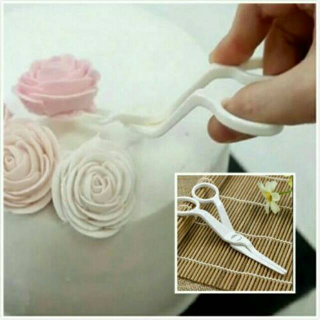 Gunting kecil / Alat bantu hias kue tart / cake / muffin / cup cakes bentuk gunting dan pipih dibagian depan yang bisa sekaligus digunakan untuk membantu menaruh hiasan bunga ( fondant / icing / sugar ) diatas kue.