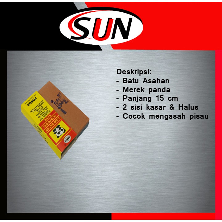 Deskripsi : - Batu Asahan - Merek Panda - Ukuran 15 cm x 5 cm x 2,5 cm - Terdiri dari 2 sisi kasar dan halus - Cocok untuk mengasah pisau atau perkakas lain.